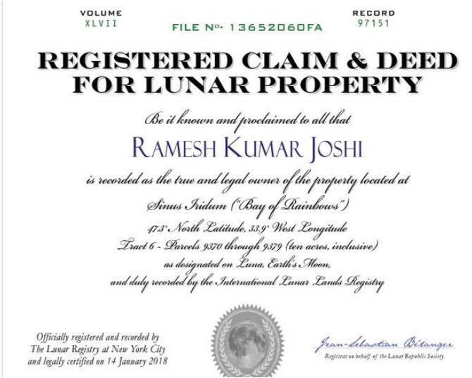 ‘एक एक्री’ बराबर नेपाली मुद्रा ३ हजार मात्रै मूल्य पर्ने रहेछ चन्द्रमामा जमिनको । त्यति बराबरको रकम जर्मनीमा रहेका छोरा उज्जवल कुमार जोशीले आफ्नो क्रेडिट कार्डमार्फत् बुबाको नाममा बुझाएपछि ‘दि लुना रजिष्ट्री’ मार्फत् चन्द्रमाको नागरिक साथै जमिनका मालिक समेत बनेको प्रमाण–पत्र पाएका जोशीले हाललाई आफ्नो सानोबेलादेखिको सोख मात्रै पूरा भएको ठानेका छन् ।टिभी अन्नपूर्णमा खबर छ ।