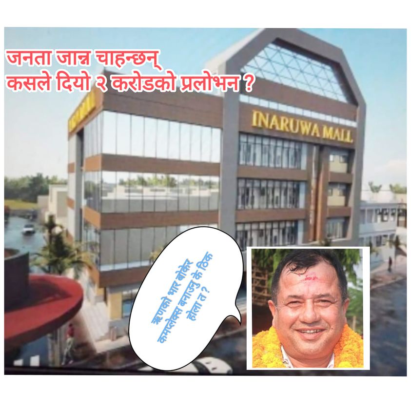 सम्बोधनका क्रममा भण्डारी भन्छन, “कमप्लेक्स निर्माणमा ठूलो चलखेल रहेछ । मलाई समेत प्रलोभन दिइयो ।” उनले भने, “सम्झौता गरेर काम मात्रै अघि बढाउन दिए २ करोड दिने अफर आयो । नक्सा डिजाइन गर्नेले रकम हात लगाइदिन्छौं भनेका छन । इनरुवाकै एक ठेकदार हुन । नाम त भन्दिन तर मैले उनिहरुको अफर ठाडै अस्विकार गरिदिए ।”