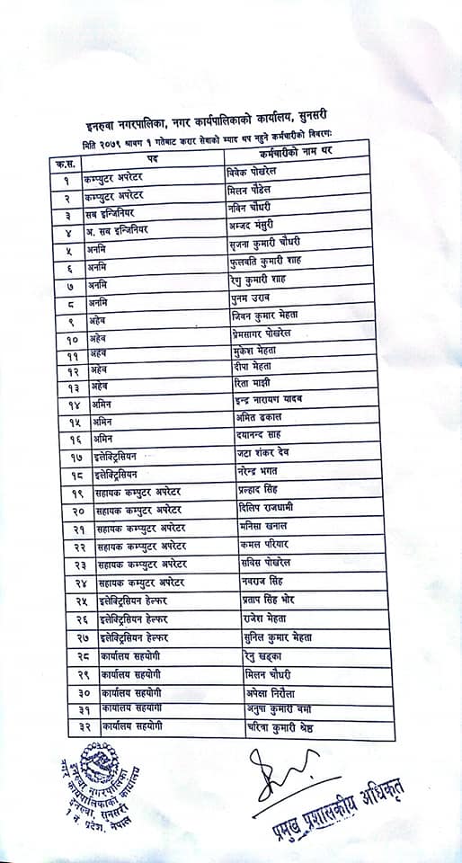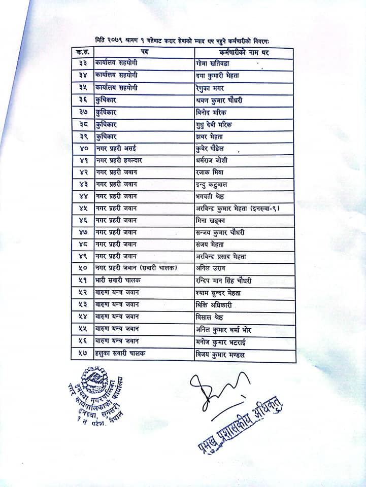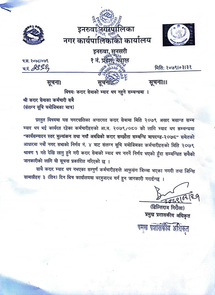 प्रमुख प्रशासकीय अधिकृत डिल्लीराज निरौलाको हस्ताक्षर रहेको सूचनामा कार्य सम्पादन स्तर मूल्यांकन तथा नयाँ अवधिको करार सम्झौता सम्बन्धि मापदण्ड २०७८ को आधारमा नवौं नगर सभाको निर्णय बमोजिम म्याद थप नहुने व्यहोरा उल्लेख छ ।म्याद थप नहुनेहरुमा कम्प्युटर अपरेटर देखि कुचिकार सम्म रहेका छन । सेवा अवधि थप नगरिएकाहरुमा कम्प्युटर अपरेटर विवेक पोखरेल, मिलन पौडेल, सव इन्जिनियर नविन चौधरी, अ.सव इन्जिनियर अम्जद मन्सुरी, अनमिहरु सृजना कुमारी चौधरी, फुलवती कुमारी शाह, रेणु कुमारी शाह, पुनम उराव, अहेव जिवन कुमार मेहता, प्रेमसागर पोखरेल, मुकेश मेहता, दीपा मेहता, रिता माझी, अमिन इन्द्र नारायण यादव, अमित ढकाल,दयानन्न साह, सहायक कम्प्युटर अपरेटर प्रल्हाद सिंह, दिलिप राजधामी, मनिसा खनाल, कमल परियार सविस पोखरेल, नवराज सिंह लगायत रहेका छन ।