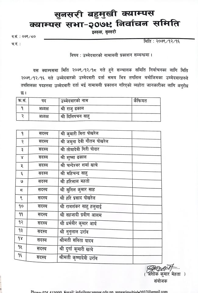 सुनसरी बहुमुखी क्याम्पस सञ्चालक समितिको अध्यक्षमा ढकाल र साहको दुई प्यानलमा पूर्व संविधान सभा सदस्य देखी पूर्व उपप्रमुख, पूर्व कृषि कार्यालय प्रमुख सम्मलाई अटाइएको छ । क्याम्पस सञ्चालक समितिको अध्यक्षका उम्मेदबार ढकालको प्यानलमा इनरुवाका पूर्व उपप्रमुख जमुना गौतम रहनुभएको छ भने साहको पूर्व संविधान सभा सदस्य सविता यादव, पूर्व कृषि कार्यालय प्रमुख नुनुलाल उराँव रहनुभएको छ । सकारात्मक कुरा के छ भने अधिवक्ता रहनुभएका ढकालले क्याम्पसको भौतिक पूर्वाधार, शैक्षिक गुणस्तर सुधार र जनतासंग जोड्ने गरि काम गर्ने प्रतिवद्धता सहित मैदानमा हुनुहुनछ । त्यसैगरी साह राजनीतिमा सकृय साहले क्याम्पसको बेथिति अन्त्य गर्ने, हटाइएको मानविकी सञ्चालन र शैक्षिक वतावरण निर्माण गर्ने, भौतिक पूर्वाधारमा सुधार गर्ने प्रतिवद्धता जनाउनुभएको छ ।