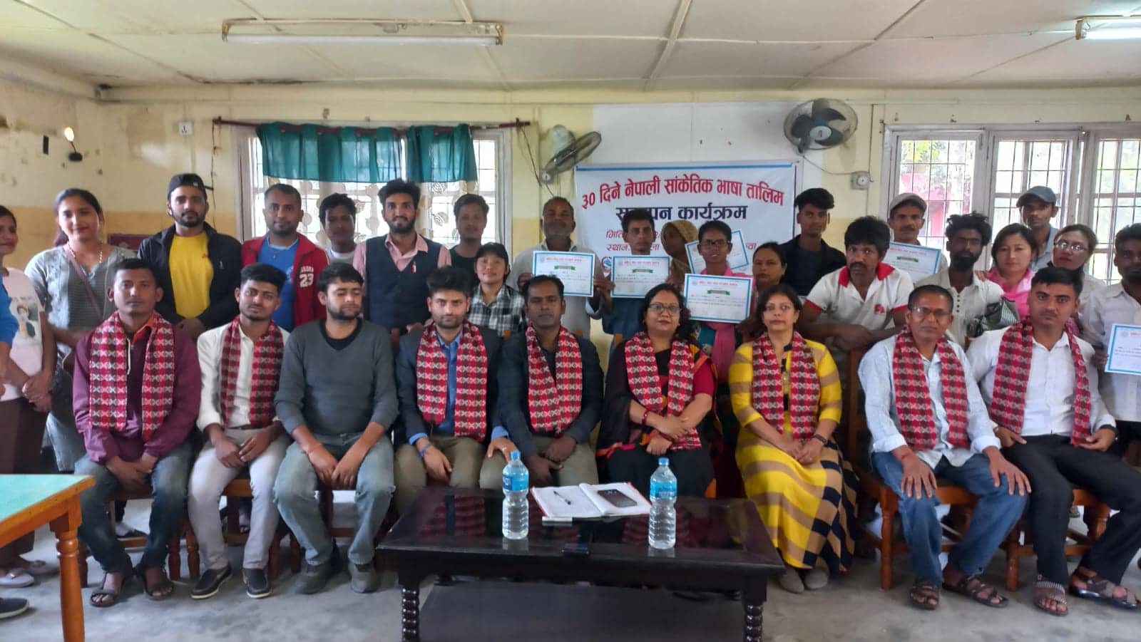 इनरुवा। सुनसरीको इनरुवा नगरपालिकाको आयोजनामा एक महिने नेपाली साङ्केतिक भाषा तालिम सनिबार सम्पन्न भएको छ । इनरुवा नगरपालिकाको सहयोग र बहिरा हित तथा संरक्षण समाज इनरुवाको आयोजनामा ३० दिने नेपाली साङ्केतिक भाषा तालिम सनिबार सम्पन्न भएको हो । नगरका बहिराअपाङ्गता भएका ब्यक्तिहरुको लागि नेपाली साङ्केतिक भाषा तालिम दिएको प्रमुख प्रशासकिय अधिकृत दशरथ राईले जानकारी दिनुभयो । इनरुवा नगरपालिकाका उपप्रमुख वीनिता मेहताको प्रमुख आतिथ्यता र अपाङ्गताको क्षेत्रमा कार्यरत बिभिन्न संस्थाहरुको उपस्थितीमा उक्त तालिमको समापन गरिएको हो । आयोजक संस्थाका अध्यक्ष अरसद मियाँले बहिराहरुको बिकासको लागी साङ्केतिक भाषा पहिलो सर्त भएको र भाषा जानेपछि मात्र अरु कार्यहरु गर्न सहज हुने भएकाले पहिले भाषाको ज्ञान भएपछि बिस्तारै अन्य सिपमुलक तालिमहरु लिन सहज हुने भएकोले यो तालिम बास्तवमै महत्वपुर्ण भएको बताउनुभयो । कार्यक्रमलाई सम्वोधन गर्दै बहिरा हित तथा संरक्षण समाजका उपाध्यक्ष मन्दिरा दाहालले साङ्केतिक भाषा तालिमको आवश्यकता र तालिमको महत्व माथि प्रकाश पार्नुभएको थियो ।
