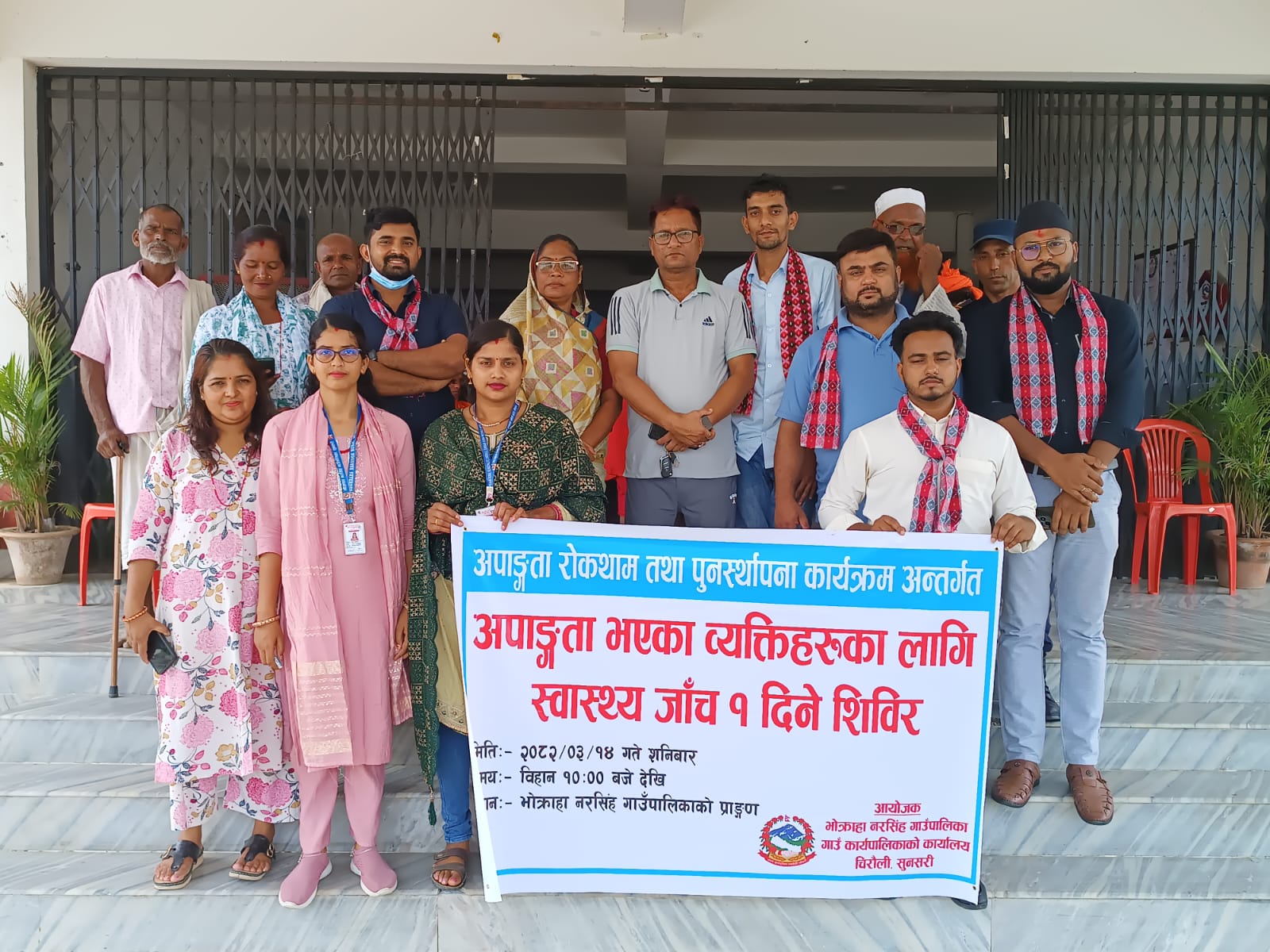 इनरुवा। भोक्राहा नरसिंह गाउँपालिकाले जिल्ला अस्पताल सुनसरीसँगको सहकार्यमा अपाङ्गता भएका व्यक्तिहरूका लागि स्वास्थ्य जाँच १ दिने शिविरको आयोजना गरेको छ। कार्यक्रमको प्रमुख अतिथि गाउँपालिकाका अध्यक्ष अजमल आजाद रहेका थिए, जसले यस प्रकारका कार्यक्रमले समाजका अपाङ्गता भएका सदस्यहरूको स्वास्थ्य र जीवनस्तर सुधार्न महत्त्वपूर्ण भूमिका खेल्ने बताएका छन्।